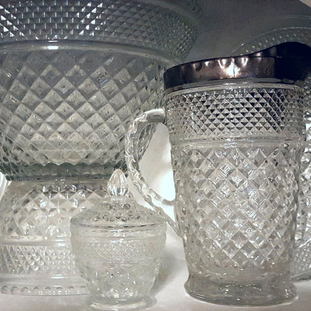I love your blog and just spent a few hours reading every one of your posts. I learned a couple things (didn’t know the salad bowl came in sapphire blue or the hexagon tray in blush), and confirmed the candy bowl, likely the whole dish, was made in green ombré. I suspected, but didn’t have proof until I saw it on your blog. There are actually two other ombré colors with gold bands and all three ombré colors were applied to two different pieces. The pieces seem to be quite rare. My name is Tina Spain McDuffie, author of “Early American Prescut Glass: A comprehensive guide to collecting Anchor Hocking’s iconic star pattern” and the eapcglass dot com website. I’m also an admin of the Wexford Collectors Facebook Group and the Early American Prescut Collectors Facebook Group. I’d love to chat with you regarding Wexford glassware and a Wexford project I’m currently working on. You can reach me via Messenger on FB or either of the groups I mentioned. I hope to hear from you.