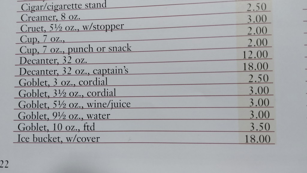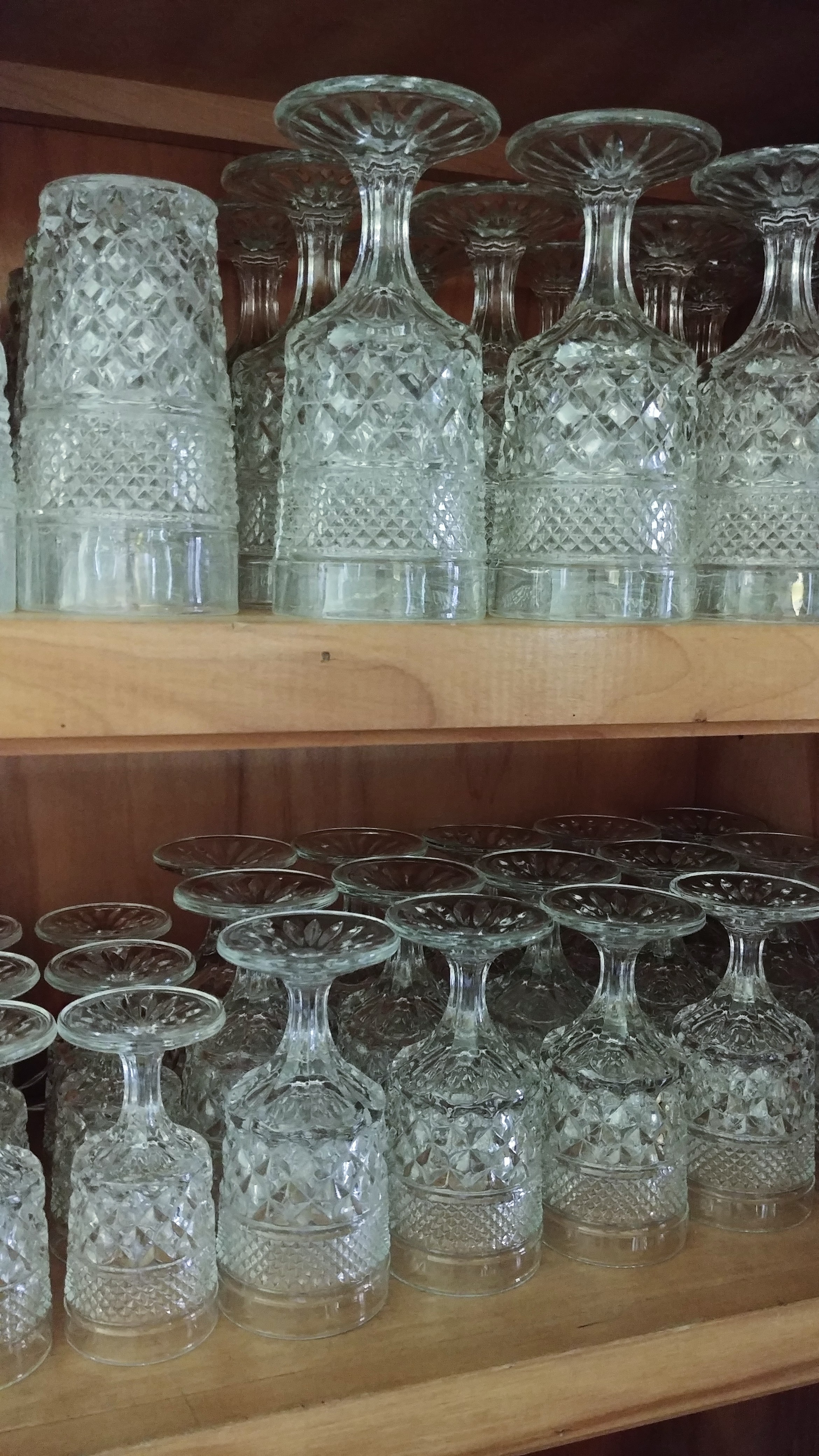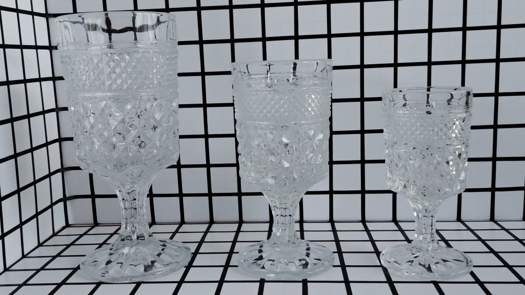 While thrifting, the wine/juice goblet is easy to find, often for $2.00 or less. The water goblet is found maybe half as often. The cordial goblet is the rarest of the three. I’ve gathered just 1.5 dozen over a decade.