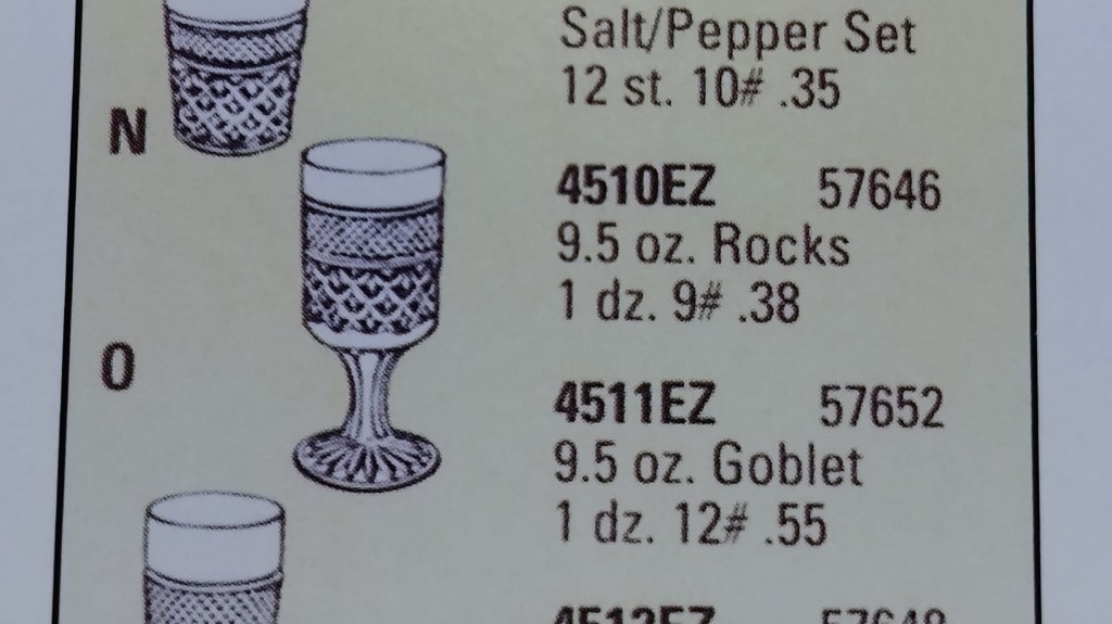 Wexford produced over a dozen glassware pieces, among them three sizes of goblet: water, wine/juice, cordial. All priced at $3.00 in the catalog.
