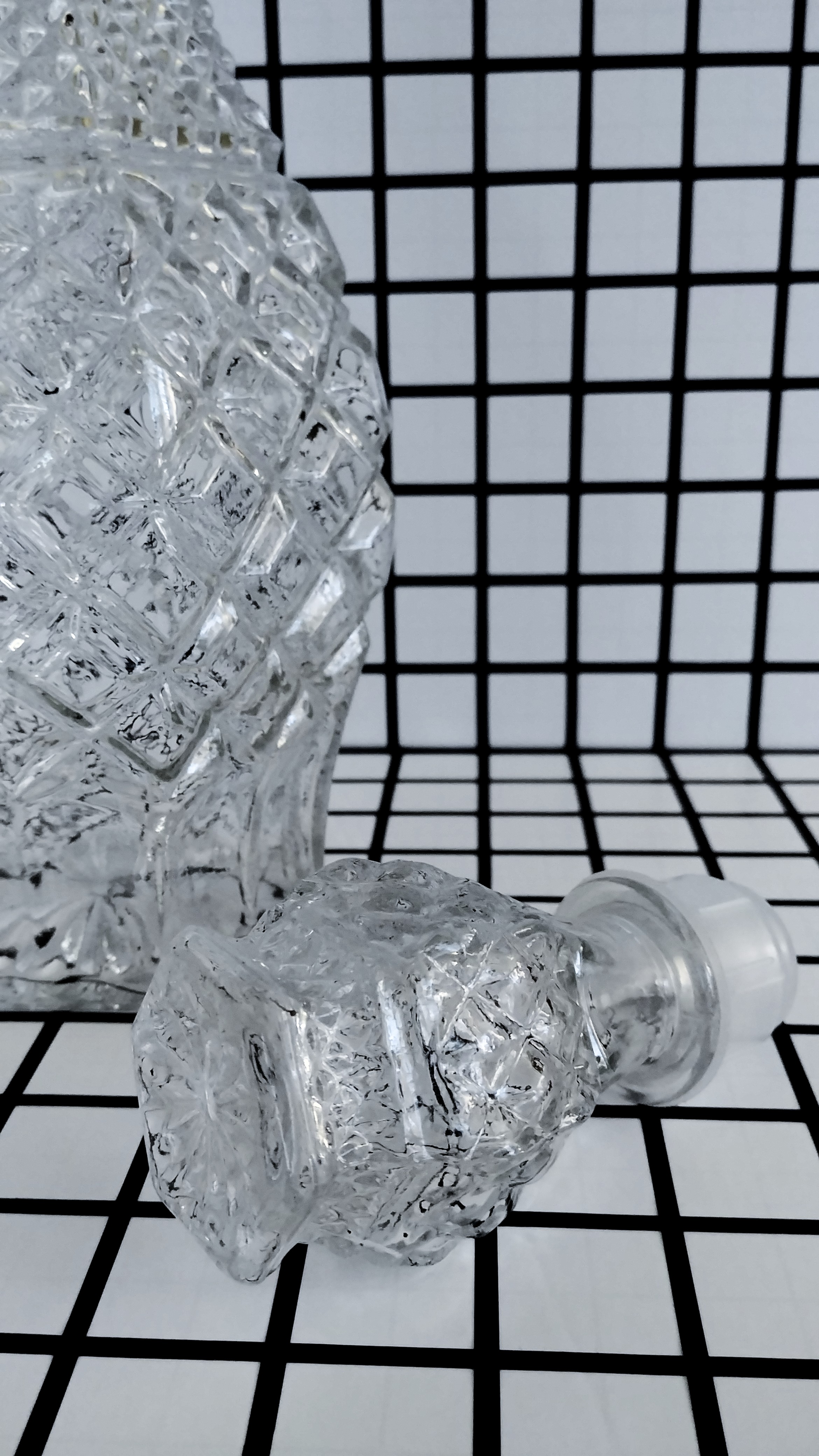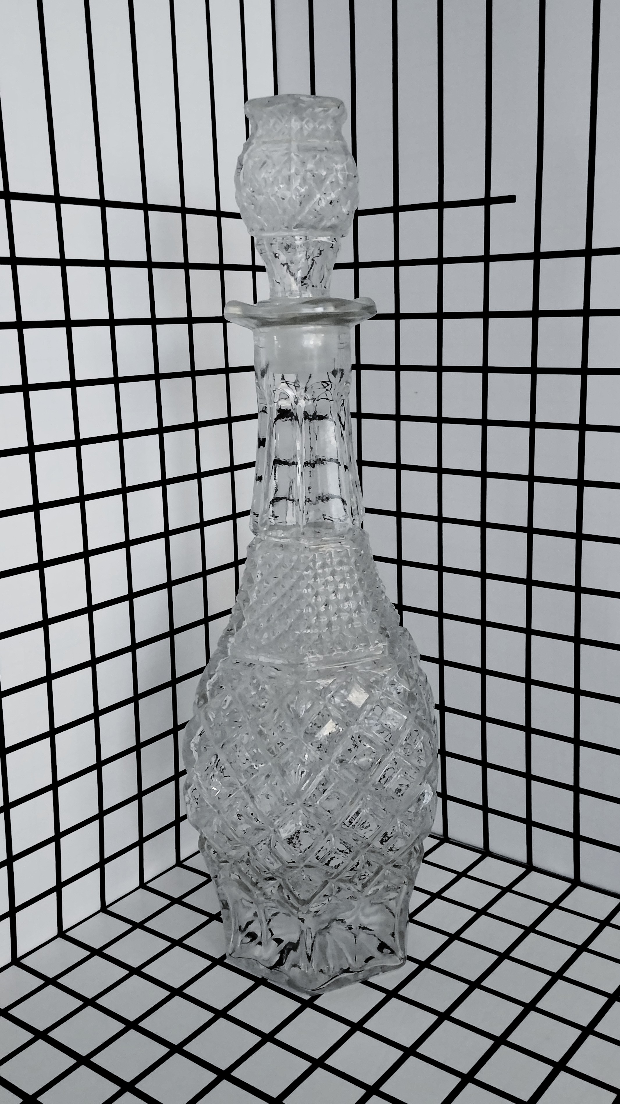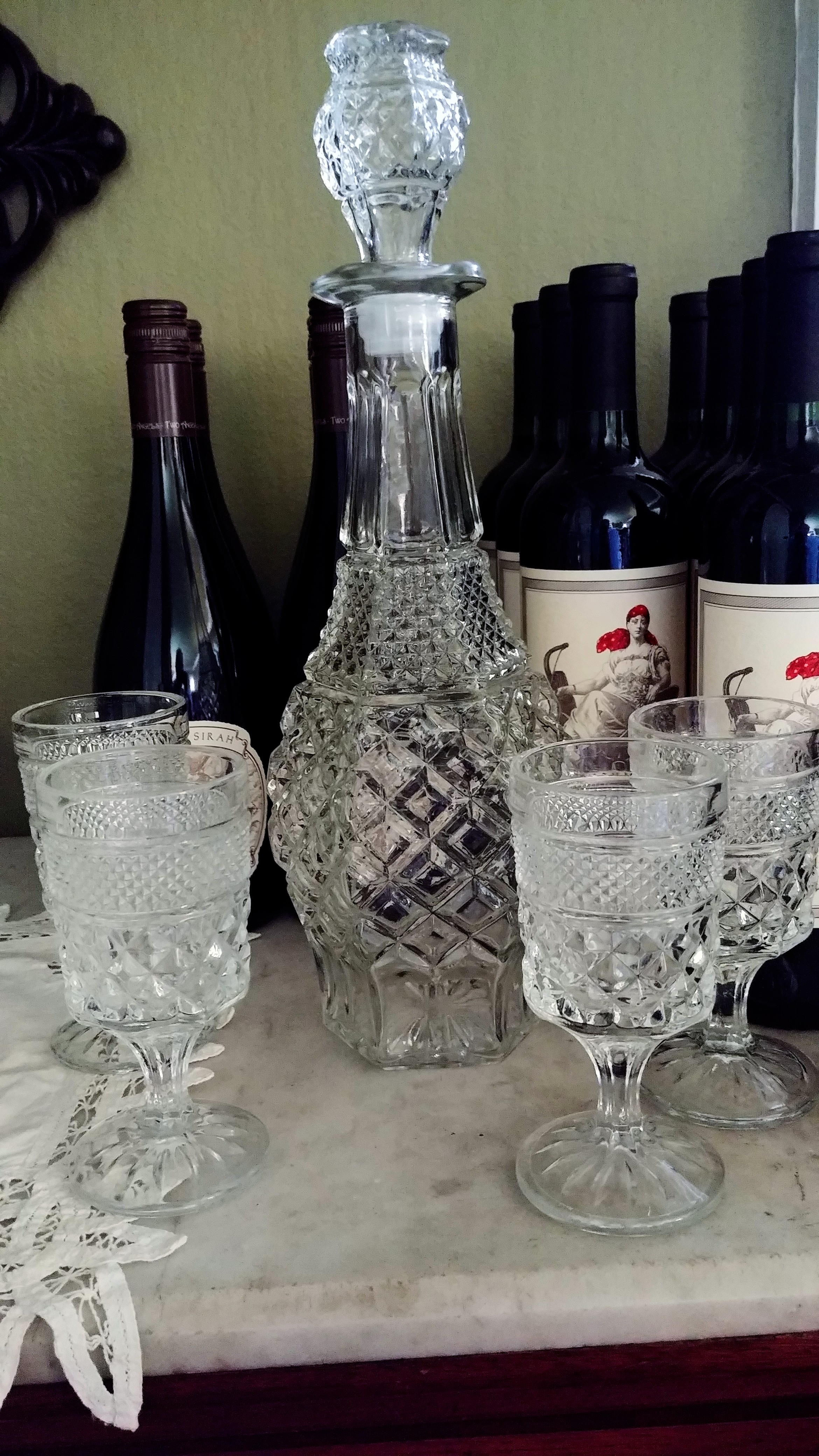 Anchor Hocking has produced at least three decanters, the most commonly found being the wine decanter. The catalog pages call it simply “Decanter” but it was sold in a set with wine glasses, hence my term for the piece. Thirty-two ounces, listed for $12.00.