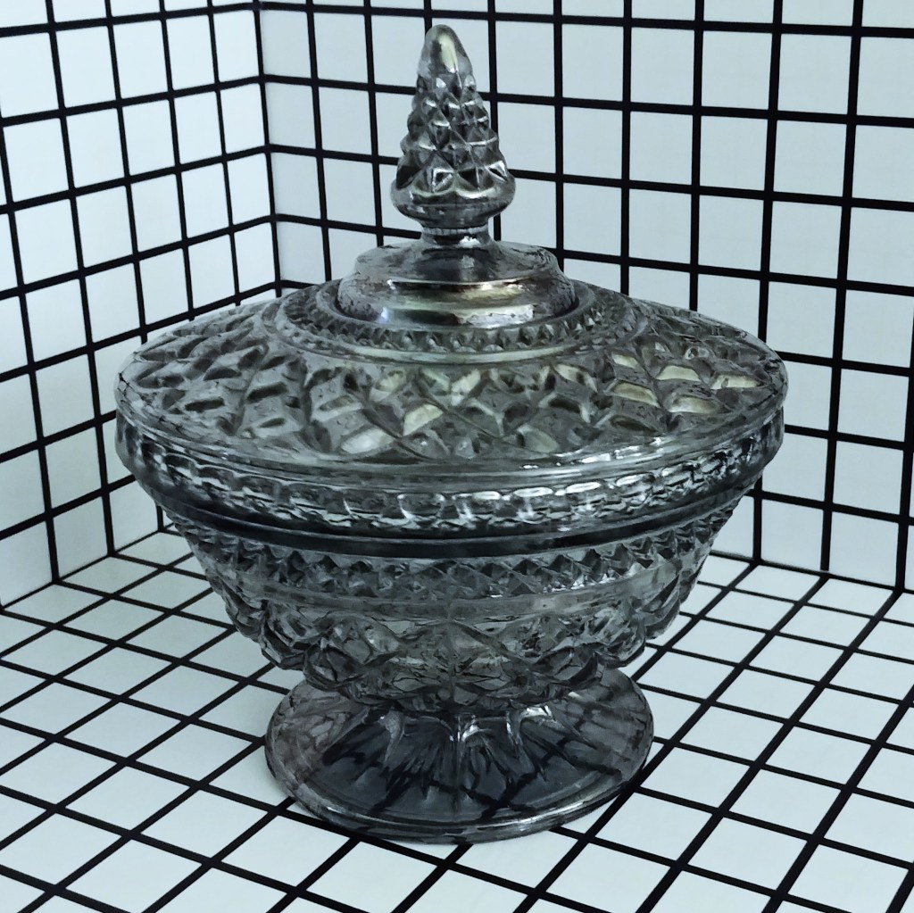 The lidded candy dish is a widely available piece in the Wexford series. The taper of the body with the footed base gives this dish a unique silhouette.