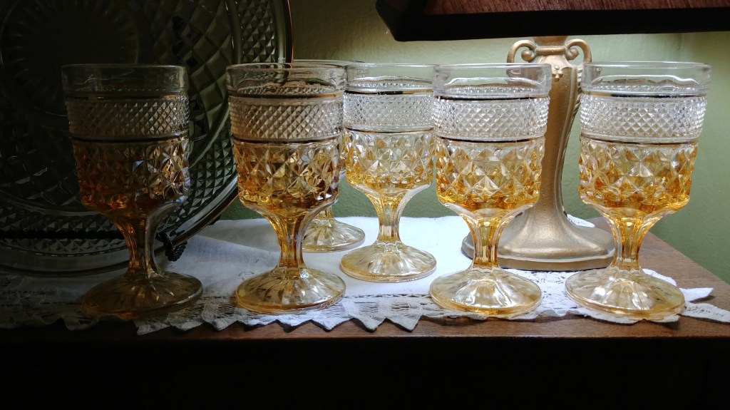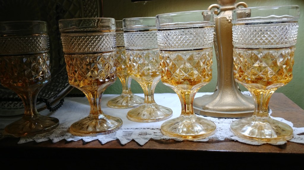 Finally, unlike any other Wexford that I own or have seen, these goblets have thin gold bands on either side of the small diamond band. The gold (Wexford gold banding is 24k) on this set is flaking off or rubbed away, but I am reminded that this was the only listing of this color on the entirety of the internet. I ain’t mad at rubbed-off gold…