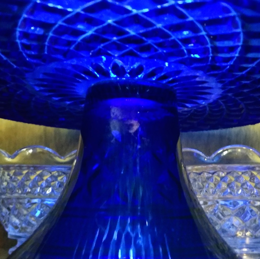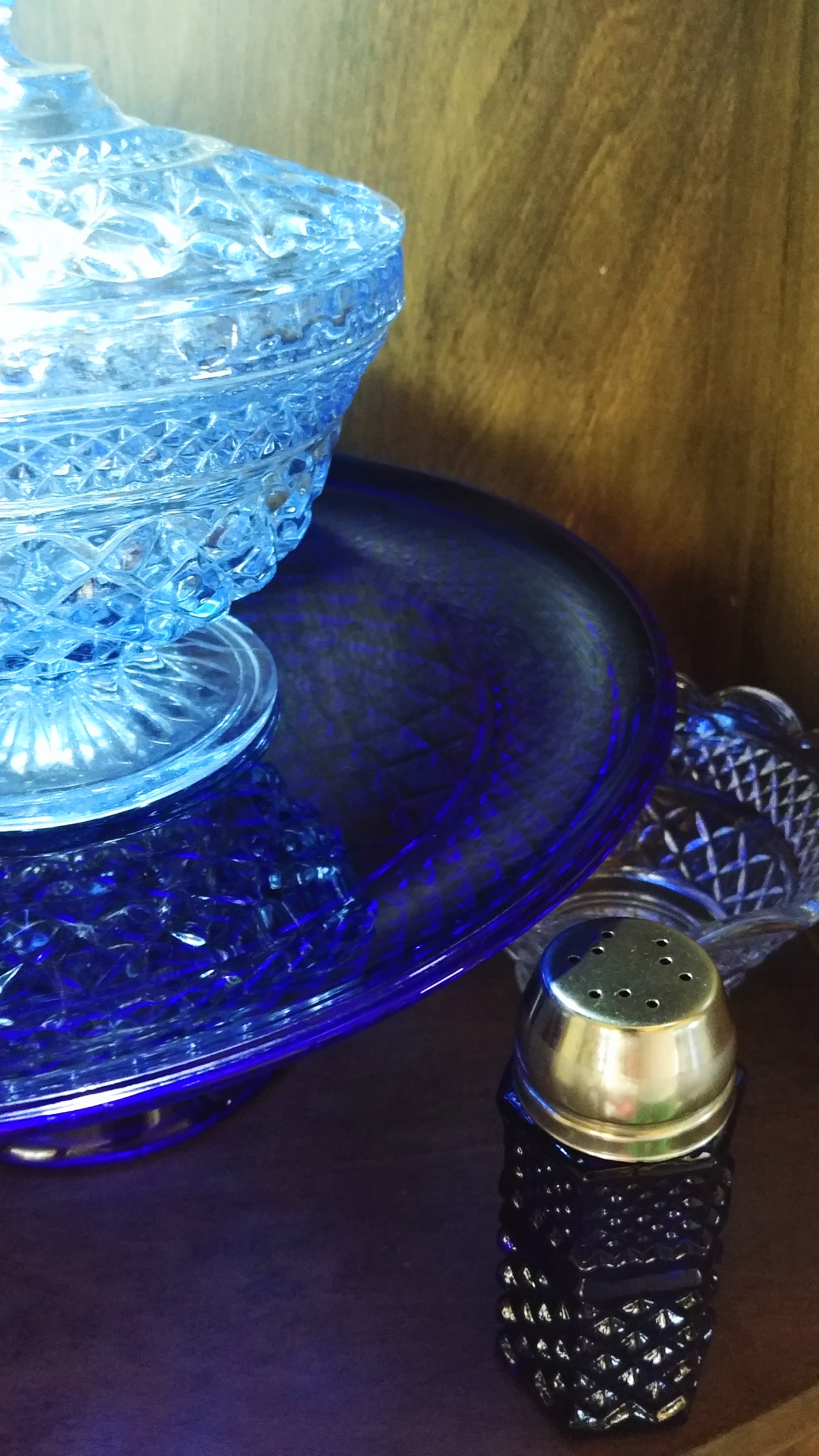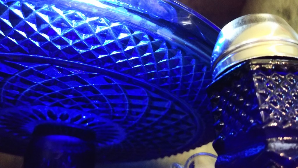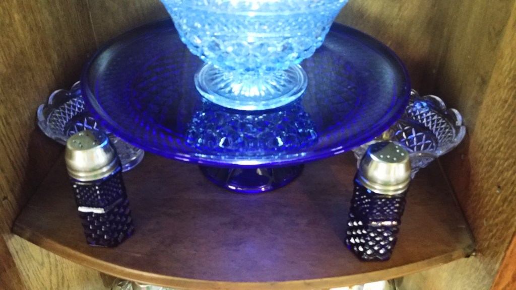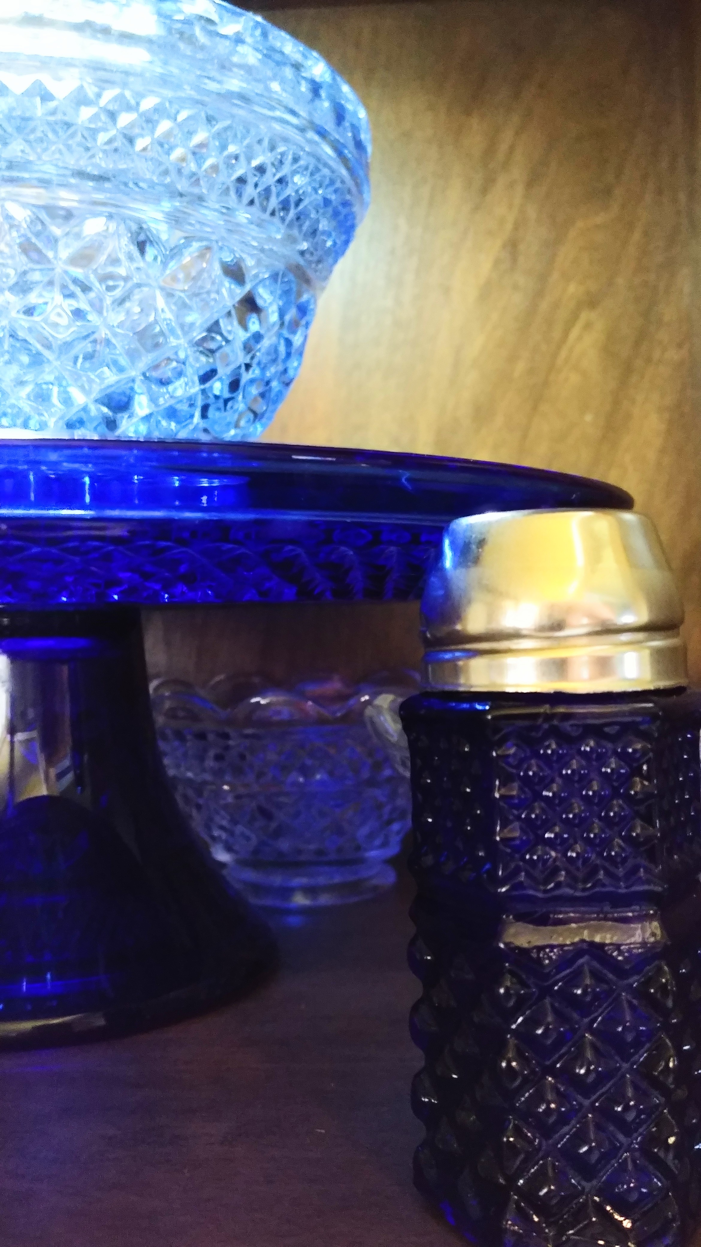 A few years ago, my husband and I selected a single piece of cobalt glass from his mother’s collection after her death, as a nice remembrance. I enjoy the idea of anchoring that piece to a small bit of our now massive glassware collection.