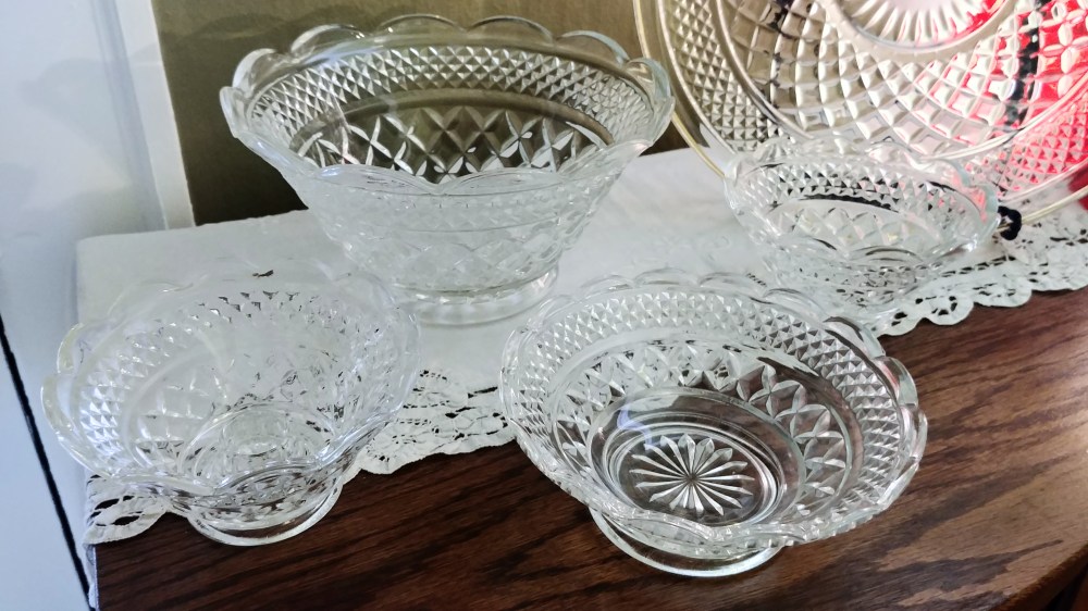 I have collected Wexford by Anchor Hocking for over a decade. I had found exactly one scalloped bowl thrifting through all that time. This past year was the first time I found any of the scalloped bowls readily for sale online. This is also the year I learned there were so many; three different sizes, plus the candle holder that I only knew about through the Fire-King book.
