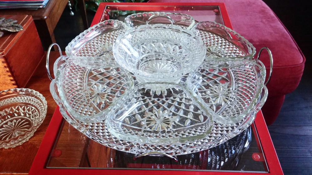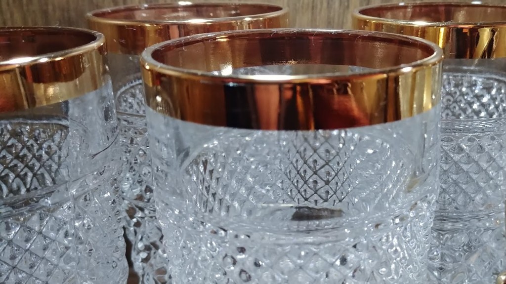 “Yes!”… She is keeping is safe wrapped and tucked in a closet in Strongsville, Ohio. In the meantime, I have been gathering the set to go with it. What is the point of a decanter without the proper glassware?