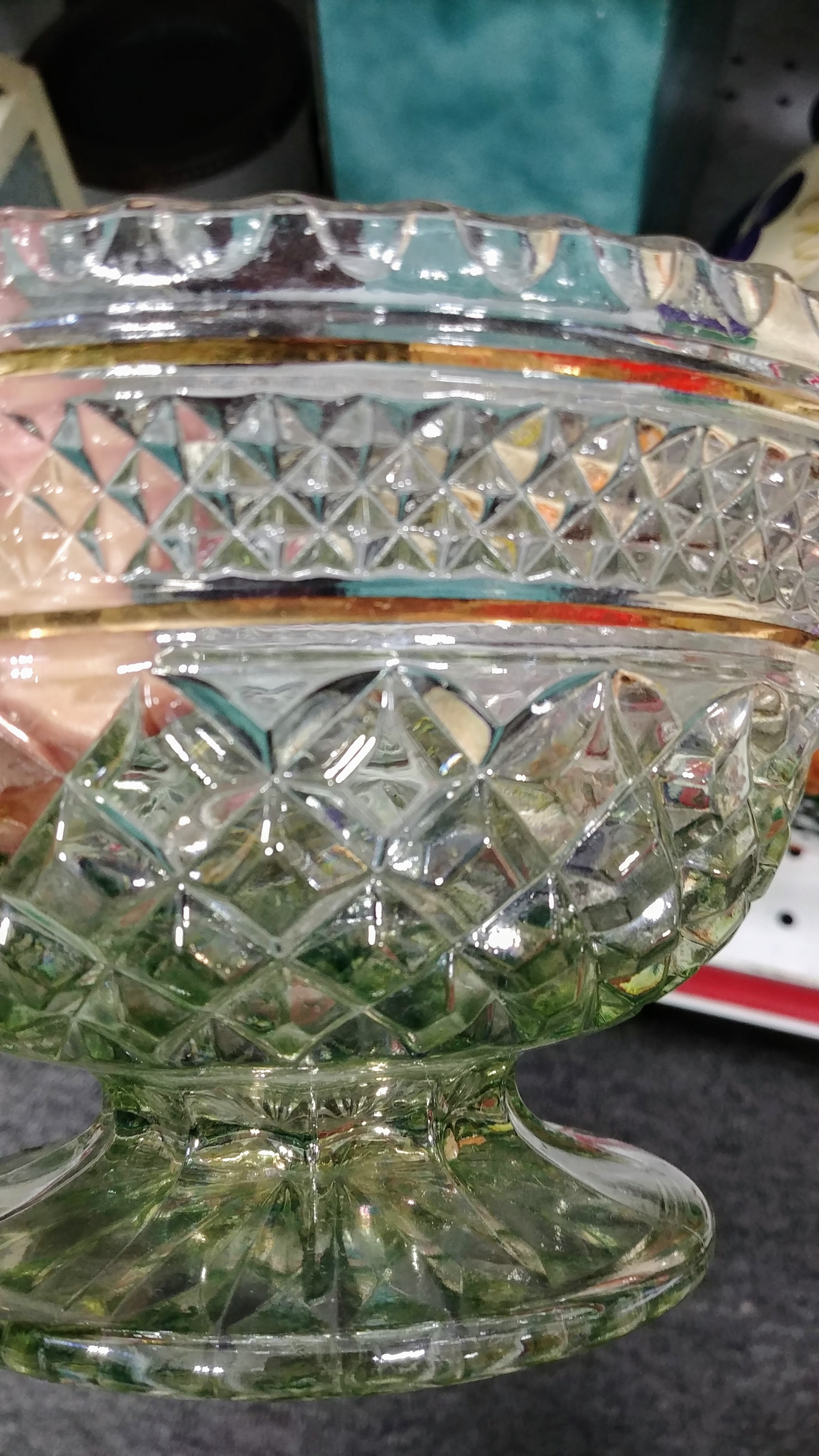 I’ll call it “moss mist” I have no documentation whatsoever on gradient flash color. I didn’t know of its existence until I found those “amber mist” wine goblets last summer, seen below. I didn’t mind the missing lid, I have numerous candy dishes at home (although I do not know if the lid would be gilded and colored) but there was a chip on the rim so I left it behind…